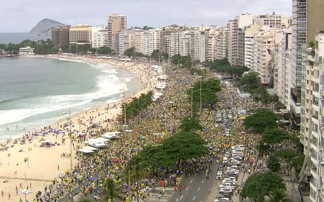 No Rio, o ato se concentrou na Avenida Atlântica, na orla de Copacabana. Manifestantes usavam, principalmente, roupas com cores verde e amarelo e carregavam bandeiras do Brasil. Por volta de 11h35, a manifestação se espalhava por quatro quarteirões.