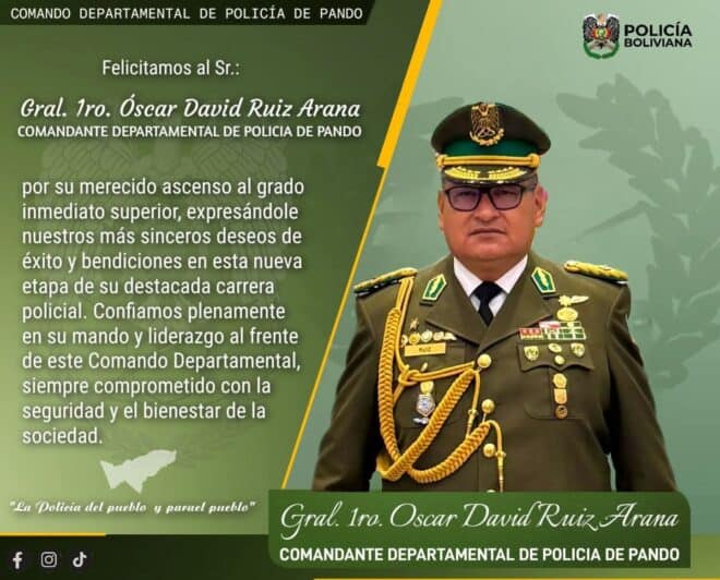 O General Óscar David Ruiz Arana, atual comandante departamental da Polícia Boliviana em Pando, foi promovido ao nível hierárquico imediato superior. A informação foi divulgada oficialmente pelo Comando Departamental, que parabenizou o oficial pelo avanço na carreira.