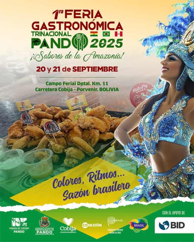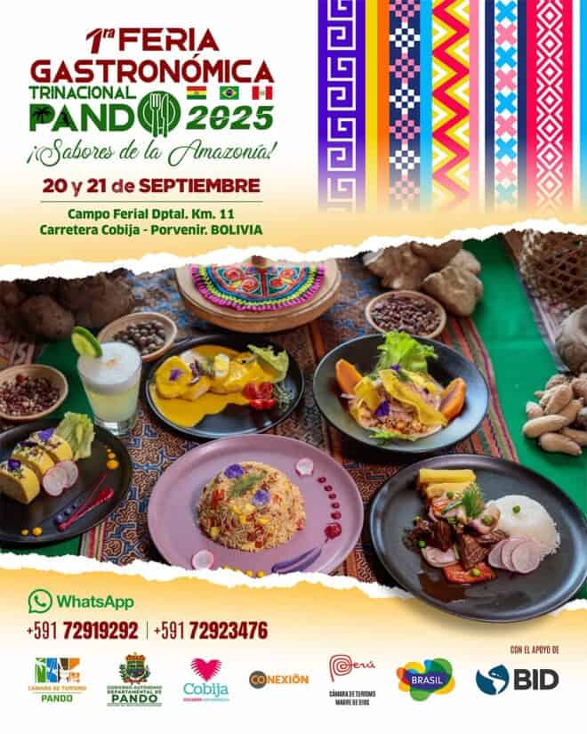 A capital do departamento de Pando, Cobija, prepara-se para receber a primeira edição da Feira Gastronômica Trinacional de Pando 2025, nos dias 20 e 21 de setembro. O evento, será realizado no Centro de Convenções Campo Ferial (Km 11 da Rodovia Cobija-Porvenir), reunirá chefs, empresários e sabores tradicionais da Amazônia boliviana, peruana e acreana, promovendo a integração cultural pela gastronomia.