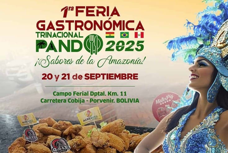 A capital do departamento de Pando, Cobija, prepara-se para receber a primeira edição da Feira Gastronômica Trinacional de Pando 2025, nos dias 20 e 21 de setembro. O evento, será realizado no Centro de Convenções Campo Ferial (Km 11 da Rodovia Cobija-Porvenir), reunirá chefs, empresários e sabores tradicionais da Amazônia boliviana, peruana e acreana, promovendo a integração cultural pela gastronomia.