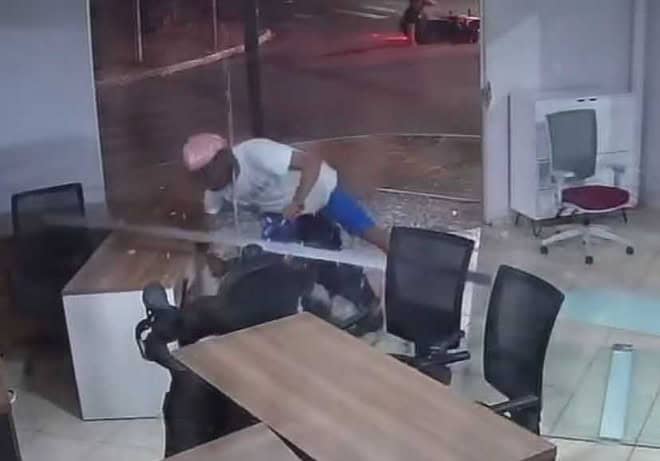 Ele conseguiu adentrar o estabelecimento após arrombar e quebrar a porta de vidro com violência. O resultado foi uma cena de destruição, enquanto o motociclista em fuga desaparecia no horizonte.