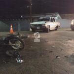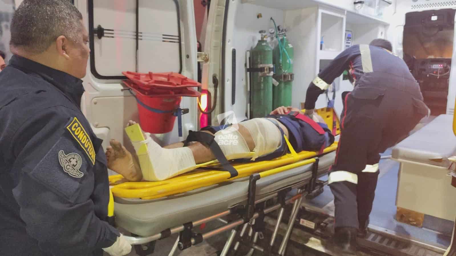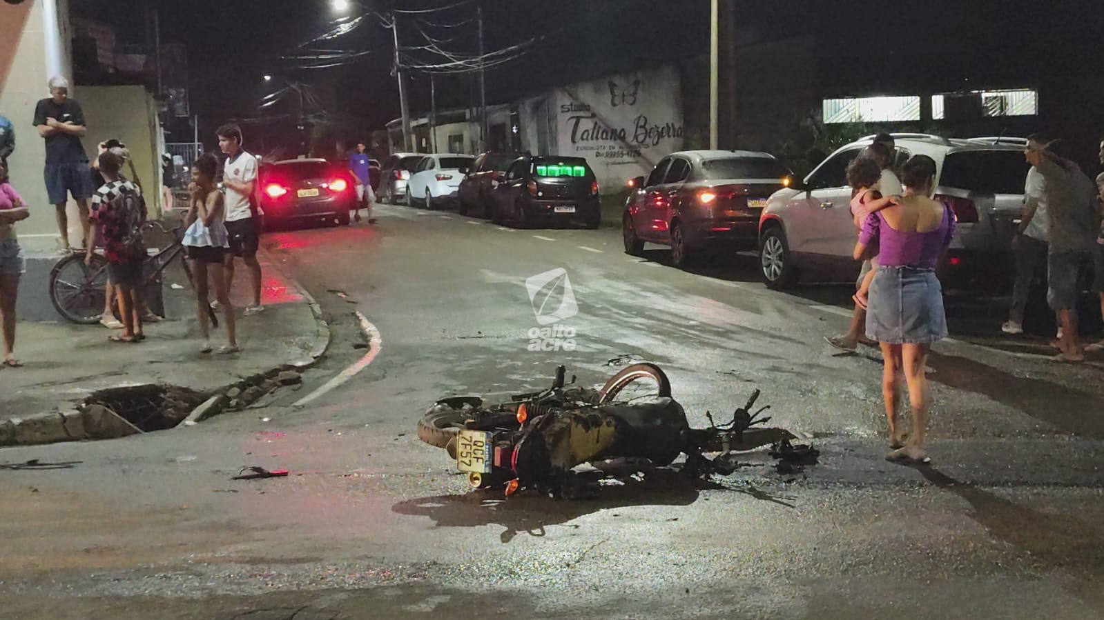 Um acidente envolvendo uma caminhonete e uma motocicleta deixou Shayd Ramon Lima de Souza, 24 anos, ferido e resultou no incêndio de sua moto na noite deste sábado (6), na Rua Isaura Parente, bairro Estação Experimental, em Rio Branco.