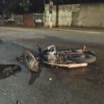 Motociclista teve fratura no fêmur; chamas destruíram parte do veículo após impacto