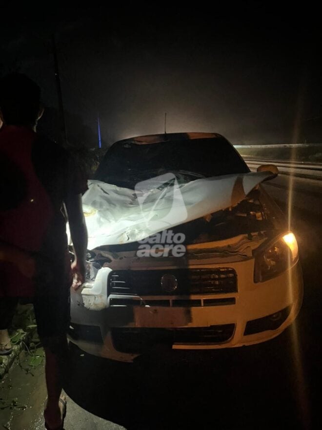 Um acidente envolvendo um carro e um boi interrompeu o tráfego por alguns minutos na BR-364, na noite desta quarta-feira (10), na região da Variante, entre Rodrigues Alves e Cruzeiro do Sul. O motorista seguia viagem quando o animal apareceu repentinamente na pista, impossibilitando qualquer manobra para evitar o choque.