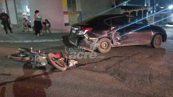 No sábado à noite, um acidente envolvendo um carro e uma motocicleta deixou um motociclista ferido em Rio Branco, no cruzamento das ruas Rio de Janeiro e Sena Madureira, no bairro Bela Vista.
