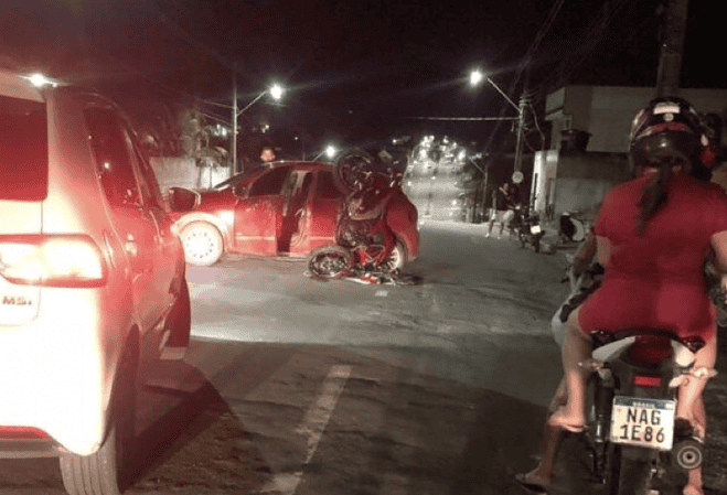 Um acidente grave envolvendo um carro e uma motocicleta ocorreu na noite deste sábado, 25, em Cruzeiro do Sul, no interior do Acre. A colisão, que foi forte, resultou em danos significativos, deixando a motocicleta quase em cima do carro, com a roda traseira levantada.