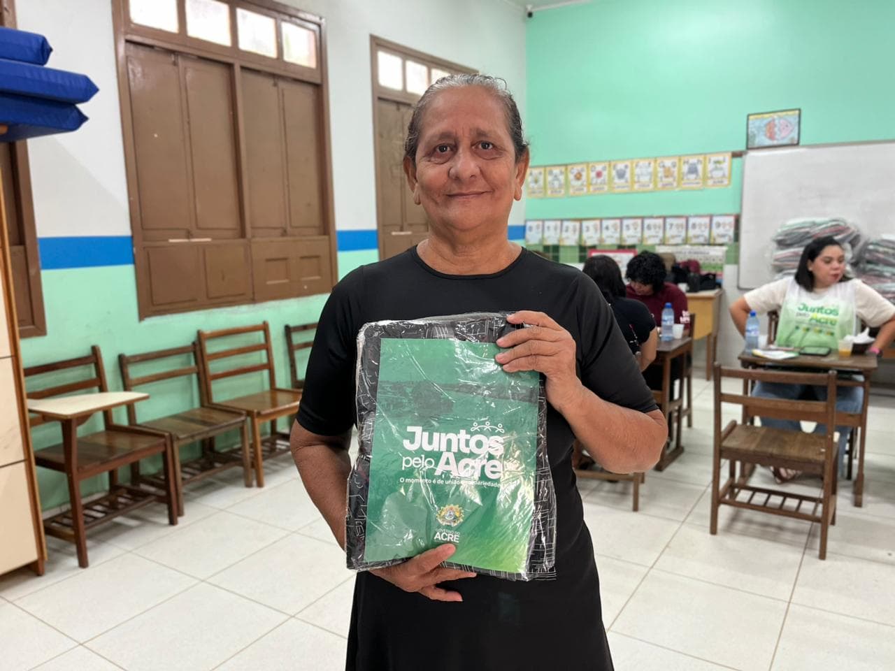 Moradora do bairro Belo Jardim, em Rio Branco, Rosilda Rodrigues expressou gratidão ao receber o kit do Vestuário Social.