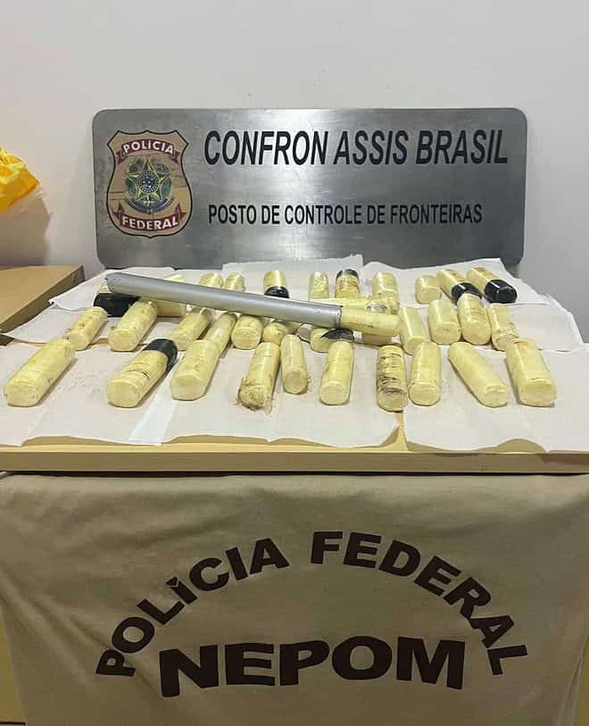 A prisão aconteceu durante uma abordagem de rotina da Polícia Federal, que atua na fronteira do Brasil com o Peru. Os agentes perceberam uma alteração nas malas que eram levadas pela viajante, na parte dos puxadores.