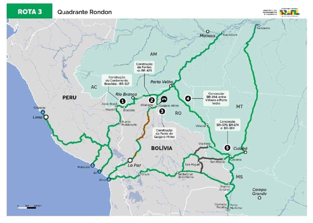 A Rota Quadrante Rondon, uma das cinco rotas de Integração Sul-Americana, liderada pelo Ministério do Planejamento e Orçamento, foi concebida após consulta aos 11 Estados brasileiros que fazem com países sul-americanos. O projeto visa não apenas fortalecer o comércio do Brasil com os países vizinhos, mas também reduzir o tempo e os custos de transporte de mercadorias, impulsionando a economia regional.