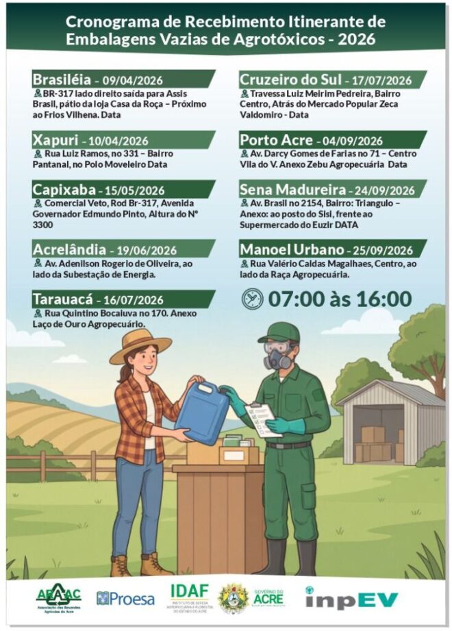 O governo do Acre, por meio do Instituto de Defesa Agropecuária e Florestal (Idaf), em parceria com a Associação das Revendas Agropecuárias do Estado do Acre (Araac) e o Instituto Nacional de Processamento de Embalagens Vazias (InpEV), divulgou o calendário oficial da campanha itinerante de recebimento de embalagens vazias de agrotóxicos para o ano de 2026.
