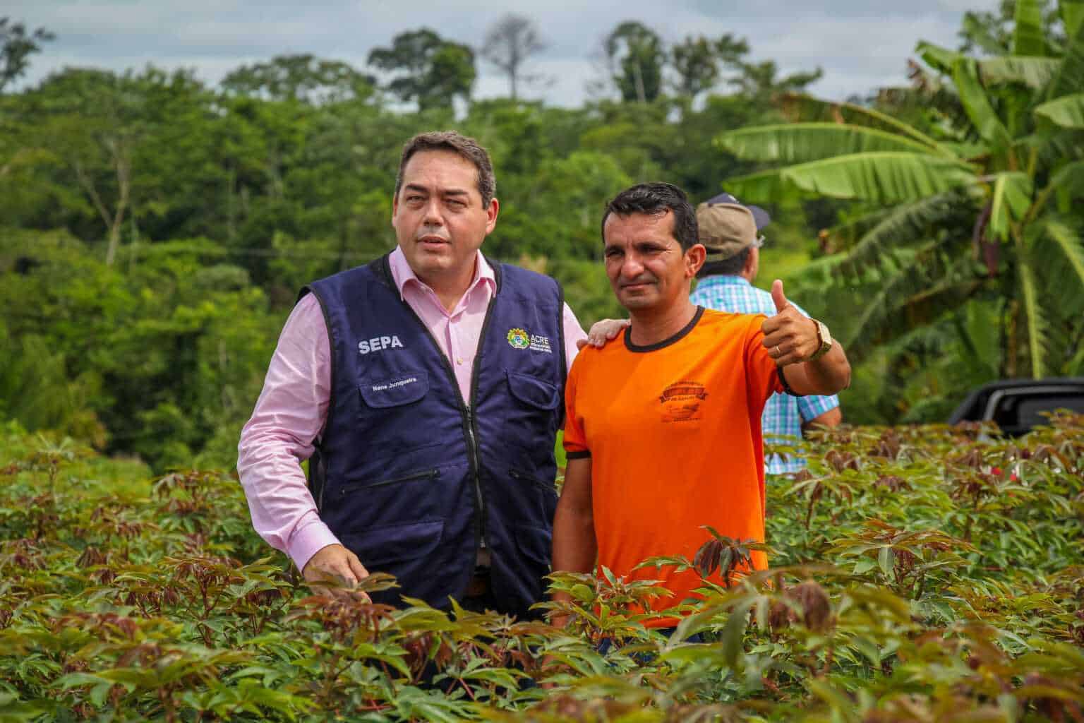Secretário Nenê Junqueira e o produtor Raimundo Nonato visitando plantação de mandioca. Foto: José Caminha/Secom.