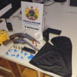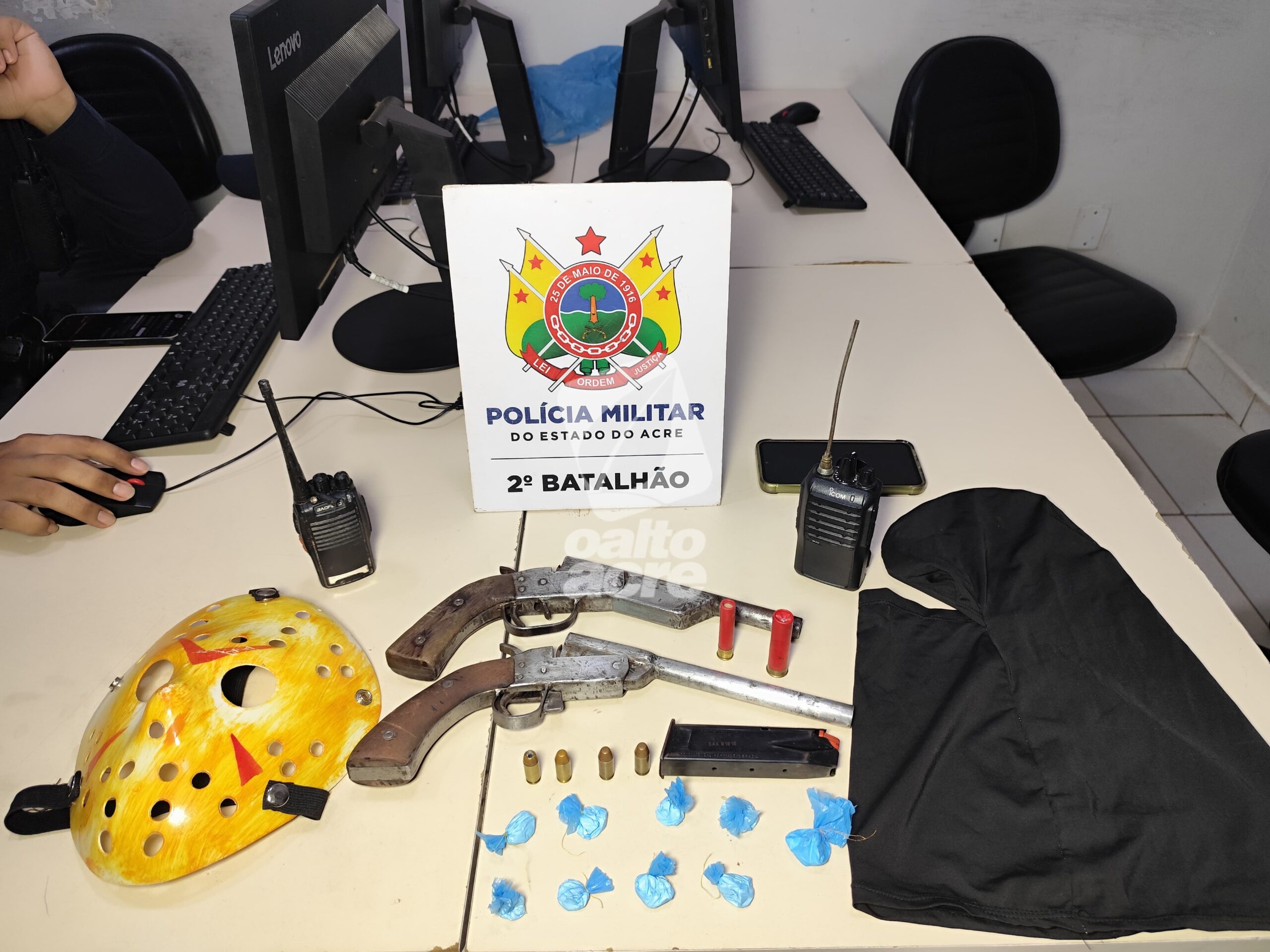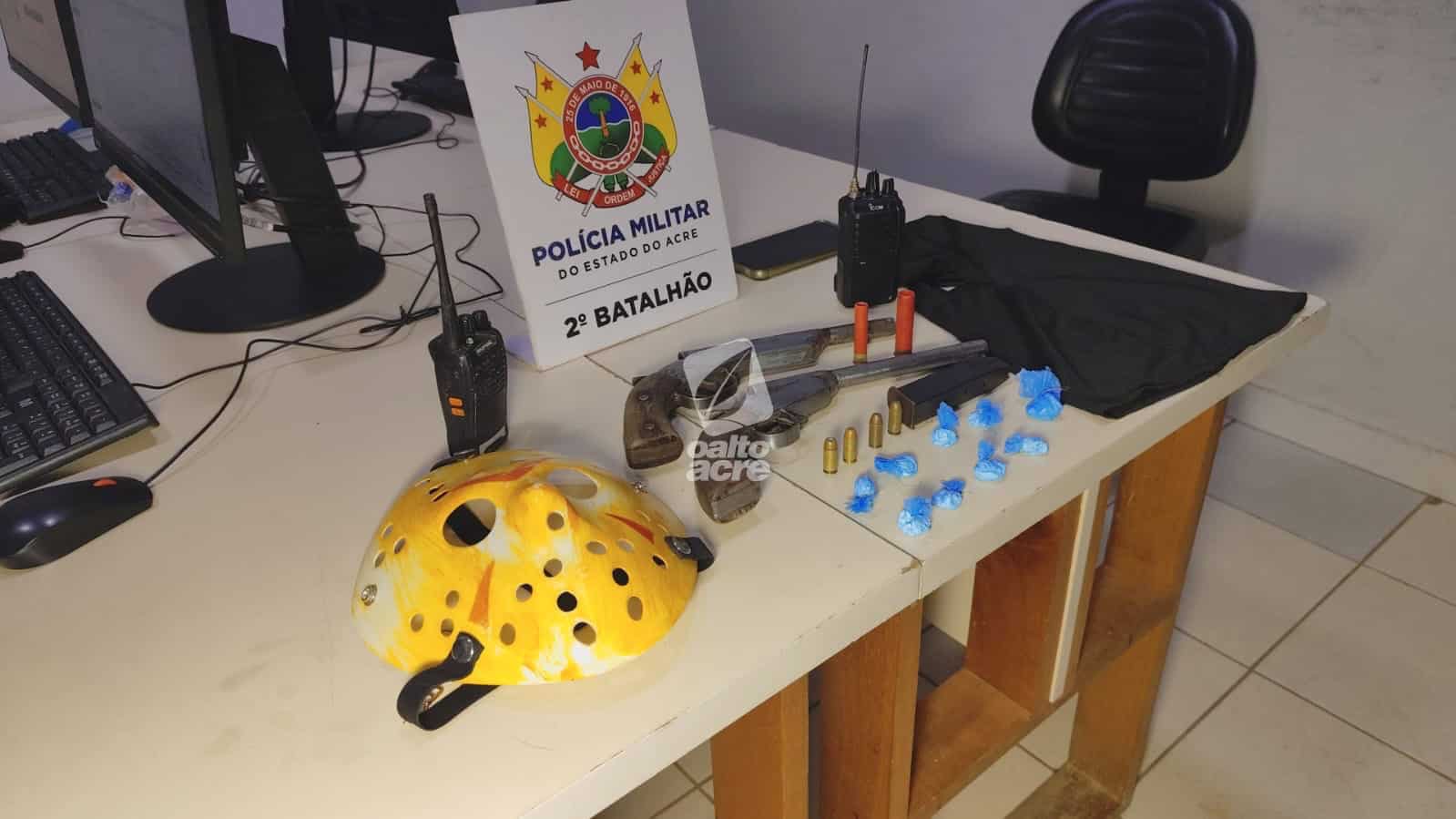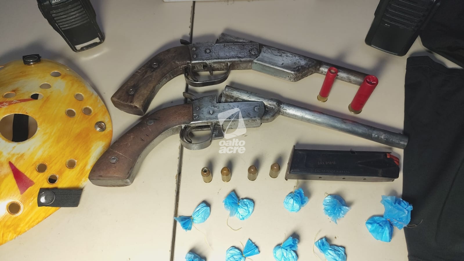Debaixo de um sofá foram encontradas duas escopetas, calibres 28 e 36, ambas municiadas com cartuchos intactos. Também foram apreendidos dois rádios comunicadores e duas balaclavas. Segundo a PM, Victor assumiu ser o dono dos materiais.