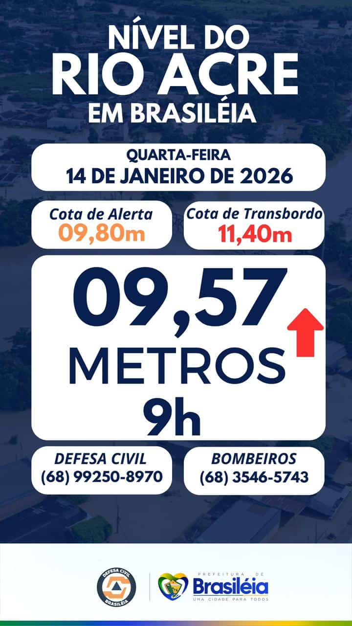 Em Brasiléia, o nível também foi de 9,57 metros por volta das 9h (horário local). As prefeituras de Brasiléia e Epitaciolândia, em parceria com a Defesa Civil, mantêm estado de atenção nas áreas mais baixas dos municípios, especialmente nas proximidades do rio e de igarapés.