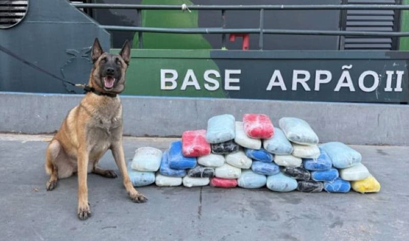 Durante a abordagem, com o apoio da cadela policial Luna, as equipes localizaram no camarote do comandante da embarcação, embaixo de um beliche, duas sacolas plásticas contendo diversas porções de substância entorpecente.