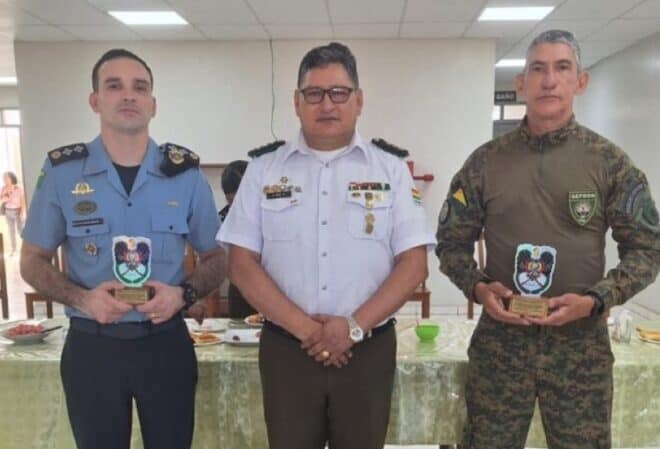 Em cerimônia realizada nesta quarta-feira (16), a Polícia Boliviana do Departamento de Pando, através do Comandante Departamental PNB Cnl. Mcs. Abg. Oscar David Ruiz Arana, homenageou o trabalho de dois importantes oficiais das Forcas de Segurança Militar do Acre: o Capitão Tales Rafael, comandante do 5º Batalhão do Alto Acre, e o Coronel Assis Santos, coordenador do Grupo Especial de Fronteira (GEFRON). A homenagem reconhece os esforços binacionais no enfrentamento aos crimes transfronteiriços.