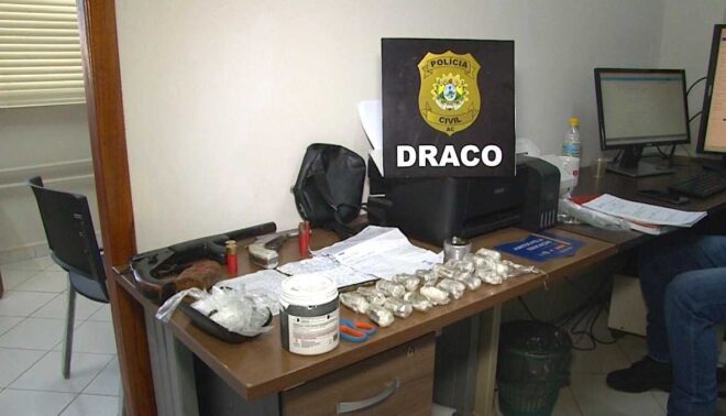 Durante o cumprimento do mandado de busca e apreensão os investigadores apreenderam duas escopetas, munições, drogas e material utilizado para refinar e embalar a droga.
