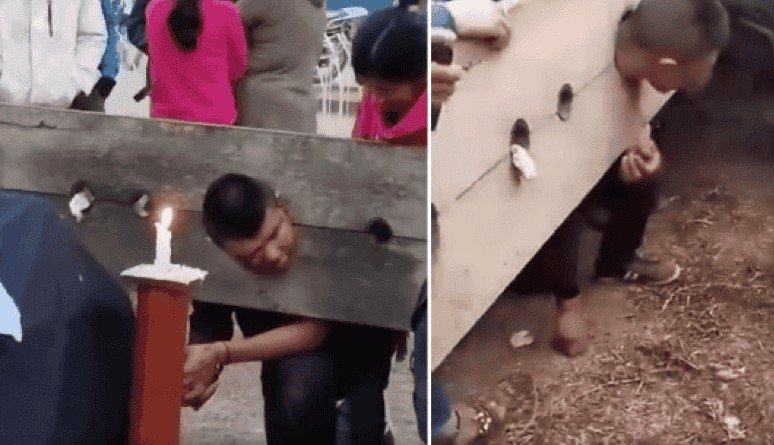 Dois homens são capturados e punidos em guilhotina de madeira ao lado da vítima na praça principal da cidade, como parte de antiga prática local contra delitos. Foto: captada