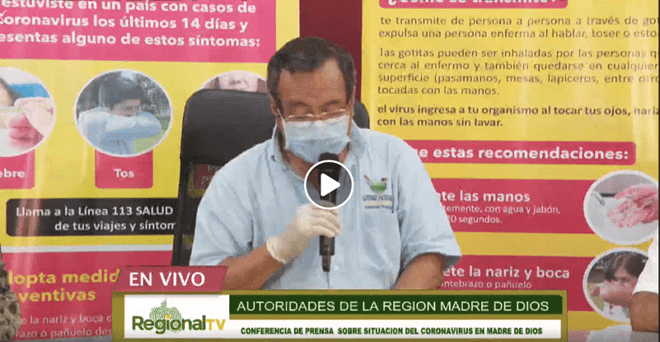 O Governador de Madre de Dios, Luís Hidalgo, deu hoje uma conferência de imprensa na cidade de Porto Maldonado-Perú, aonde informou que foi confirmado um caso de coronavírus em Iñapari, cidade peruana que faz fronteira com Assis Brasil.