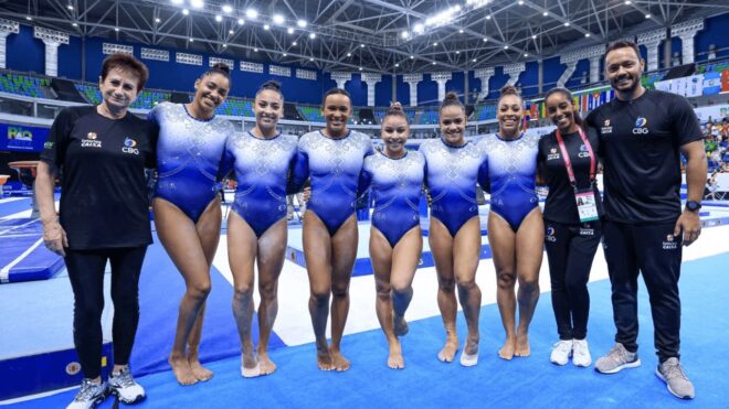 A campeã olímpica Rebeca Andrade recebeu mais uma medalha de ouro, mas dessa vez, ao lado das 5 ginastas, que garantiram o Brasil campeão por equipes femininas no Pan-Americano do Rio de Janeiro.