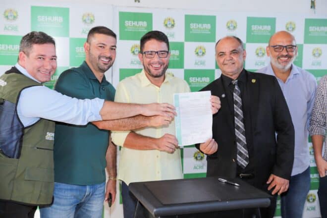 Aprovado pela Assembleia Legislativa no ano passado, o projeto que autorizou financiamento para construção de 1.383 unidades habitacionais na Cidade do Povo, em Rio Branco, teve a ordem de serviço assinada pelo governador Gladson Cameli na presença do presidente da ALEAC, Nicolau Júnior, na tarde desta terça-feira,4, no conjunto Cidade do Povo.