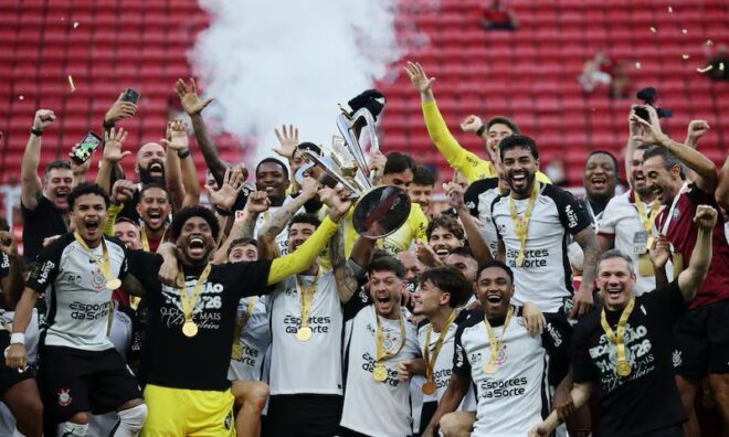 O Corinthians é o grande campeão da Supercopa. O Timão venceu o Flamengo por 2 a 0 neste domingo (1º), no Mané Garrincha, e é o primeiro time a soltar o grito de campeão na temporada 2026. Gabriel Paulista e Yuri Alberto marcaram os gols da vitória corintiana. O Rubro-Negro ainda teve Carrascal expulso na volta do intervalo.