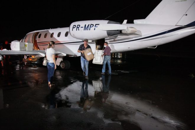 Pelo menos 42 caixas de novos insumos, entre luvas profissionais, enzimas e kits de extração (tubos e paletas de coletas de amostras) para a checagem de novos casos de contaminação por coronavírus chegaram a Rio Branco, na noite desta sexta-feira, 3, em um jato Cessna Citation 3, de médio porte, fretado pelo Governo do Estado do Acre para esta finalidade.