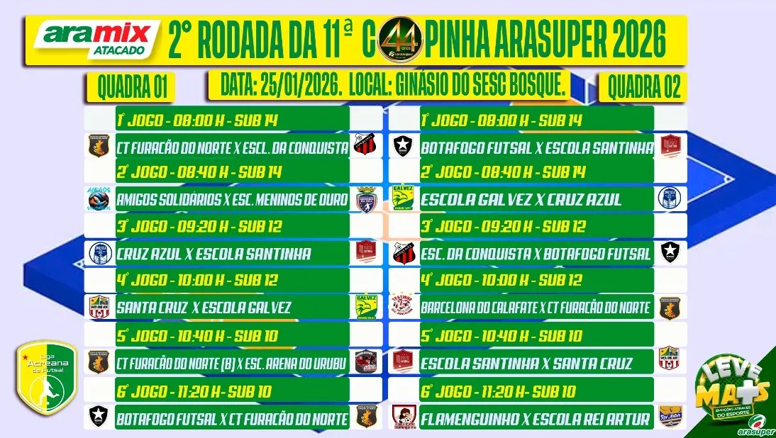 O ginásio do Sesc recebe na manhã deste domingo (25), a partir das 8h, a segunda rodada da 11ª Copinha Arasuper de Futsal. Um total de 12 partidas serão disputas em duas quadras distintas.