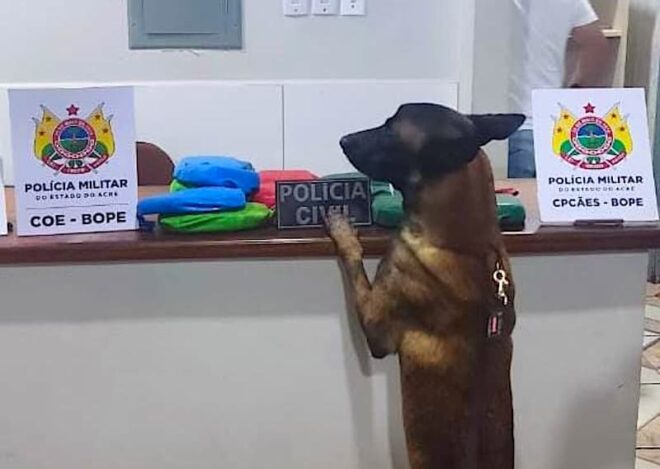 Polícias militares da Companhia de policiamento com cães (Cpcães) e da Companhia de Operações Especiais ( Coe) do Batalhão de Operações Especiais (Bope), da Polícia Militar apreenderam na manhã de segunda-feira, 15, durante abordagem a um ônibus de transporte coletivo, na BR 364, proximidades do Bujari, 16 quilos de entorpecentes.