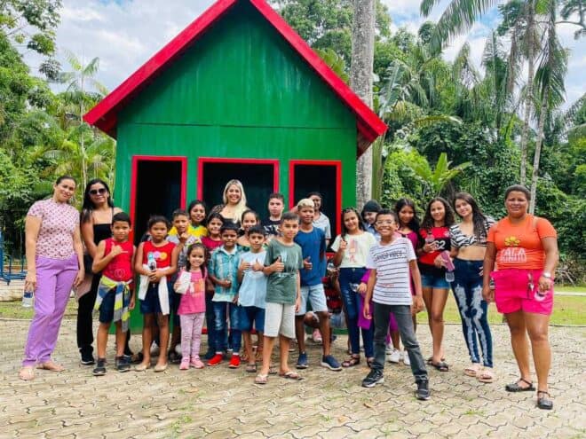 Durante o passeio, as crianças puderam visitar o zoológico, com espécies de animais da Amazônia, caminhar pelas trilhas ambientais e brincar nos parquinhos infantis que tem dentro do Parque.