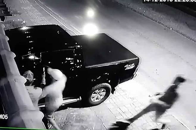 As imagens que aparecem no vídeo são de uma câmera de monitoramento e mostram o momento exato em que os três homens chegam correndo na porta do motorista e anunciam o assalto, arrancando ele e sua filha, de apenas 3 anos, de forma violenta de dentro do carro.