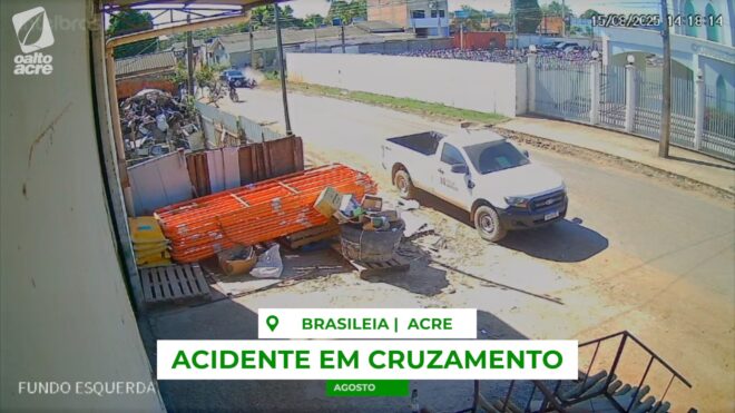 Uma jovem identificada como Luana Maria Oleario da Silva, de 20 anos, ficou ferida após se envolver em um acidente no início da tarde desta sexta-feira (15), no bairro Ferreira Silva, em Brasiléia. O caso ocorreu por volta das 14h10, no cruzamento das ruas Joaquim Alves e Ernestino do Amaral, e foi registrado por câmeras de segurança.