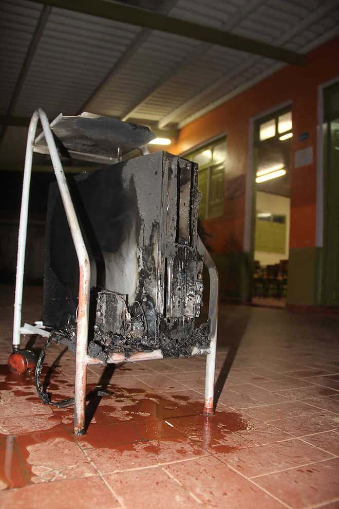 Dentro da sala que estava cheia de uma densa fumaça, encontram uma CPU em curto e iniciando um incêndio. De principio, se pensava que fosse um ‘no-break’, aparelho que possui uma bateria interna ligado na rede elétrica, usado para evitar corte repentino de energia no computado.