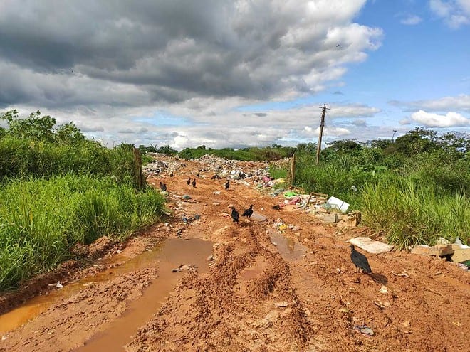 Contudo, as imagens enviadas pelo morador ao ac24horas mostram que o lixo está sendo despejado a céu aberto e que logo abaixo do local onde está situado o aterro sanitário passa um igarapé. Também é possível ver que os resíduos estão sendo descartados muito próximo à estrada, em uma área que se encontra aberta – sem a existência de portão.