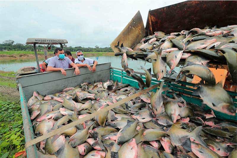 Depesca de tambaqui em criadouro no Amazonas: produção em viveiro caiu no estado. Foto: Secom