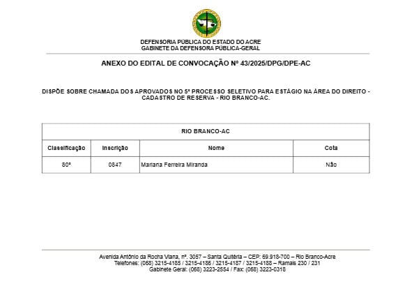 A Defensoria Pública-Geral do Estado do Acre publicou nesta quinta-feira, 28, o Edital de Convocação nº 43/2025/DPG/DPE-AC, que oficializa o chamamento de uma candidata aprovada no 5º Processo Seletivo para Estágio na Área do Direito – Cadastro de Reserva, com atuação na sede da instituição.