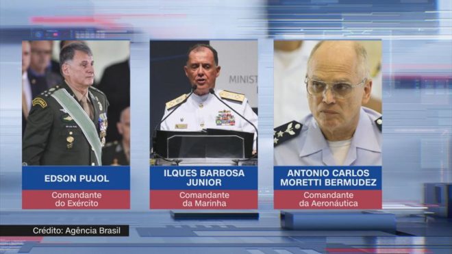 O Ministério da Defesa informou nesta terça-feira (30) que os três comandantes das Forças Armadas serão substituídos: Edson Pujol, do Exército, Ilques Barbosa Junior, da Marinha, e Antonio Carlos Moretti Bermudez, da Aeronáutica.