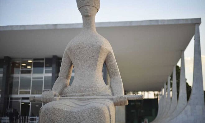 Fachada do Supremo Tribunal Federal (STF) com estátua A Justiça, de Alfredo Ceschiatti, em primeiro plano.
