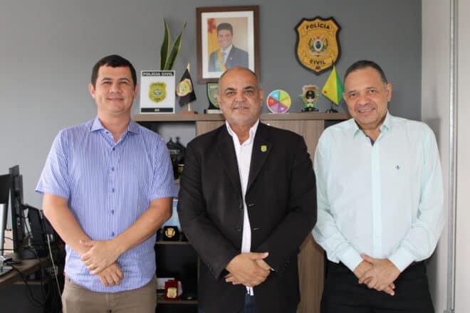 O delegado-geral da Polícia Civil do Acre, Dr. José Henrique Maciel, recebeu em seu gabinete, nesta sexta-feira, 21, o excelentíssimo deputado estadual Manoel Morais (líder do governo na ALEAC) e o excelentíssimo prefeito de Xapuri, Maxsuel Maia Pereira. O encontro teve como objetivo discutir melhorias na segurança pública do município, especialmente no fortalecimento do trabalho da Polícia Civil.