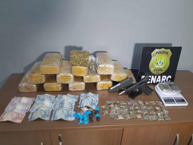 No local, os agentes da PCAC encontraram mais de 12 quilos de drogas, além de pequenas porções já embaladas para a venda, dinheiro e dois simulacros de arma de fogo. Um dos suspeitos detidos possuía antecedentes criminais relacionados ao tráfico de drogas.