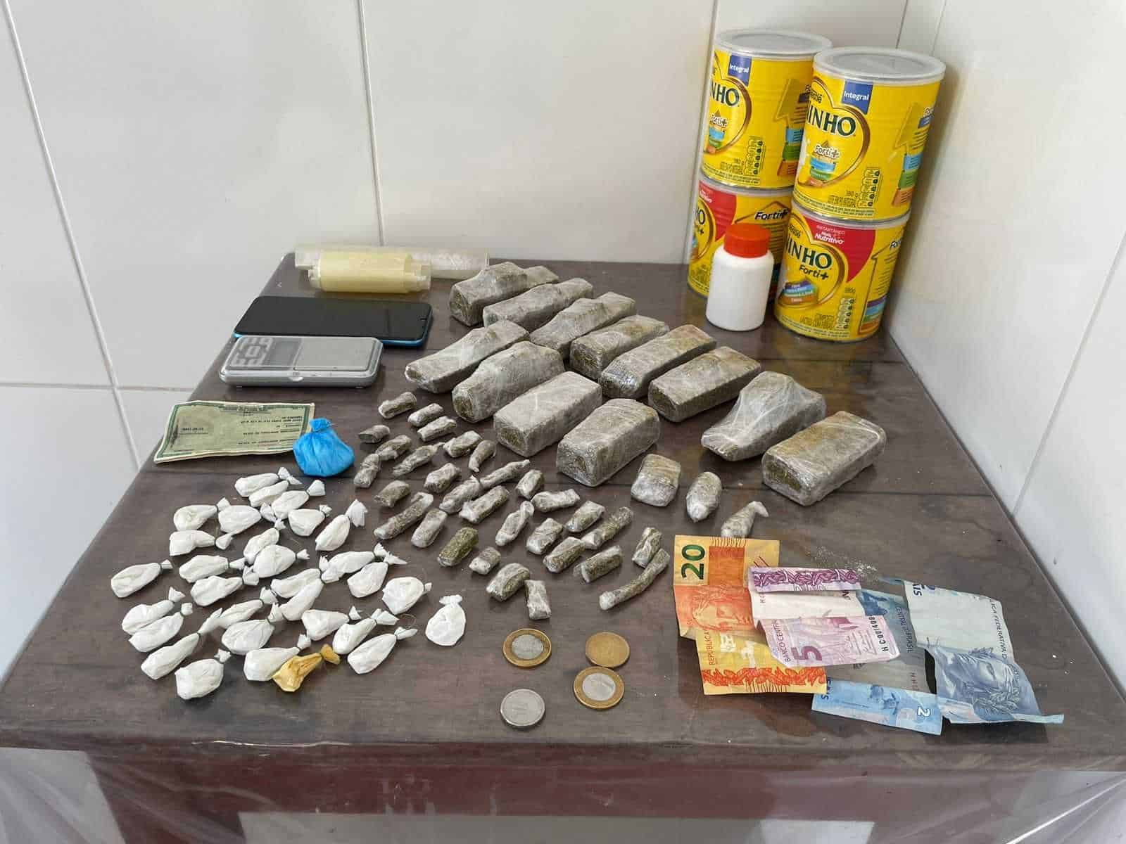 Os militares do 7° BPM localizaram 32 trouxinhas de maconha em um quarto e, com auxílio do Cão Policial Luck, foram localizadas 13 barras de maconha em outro quarto, e mais 31 trouxinhas de cocaína e uma balança de precisão.