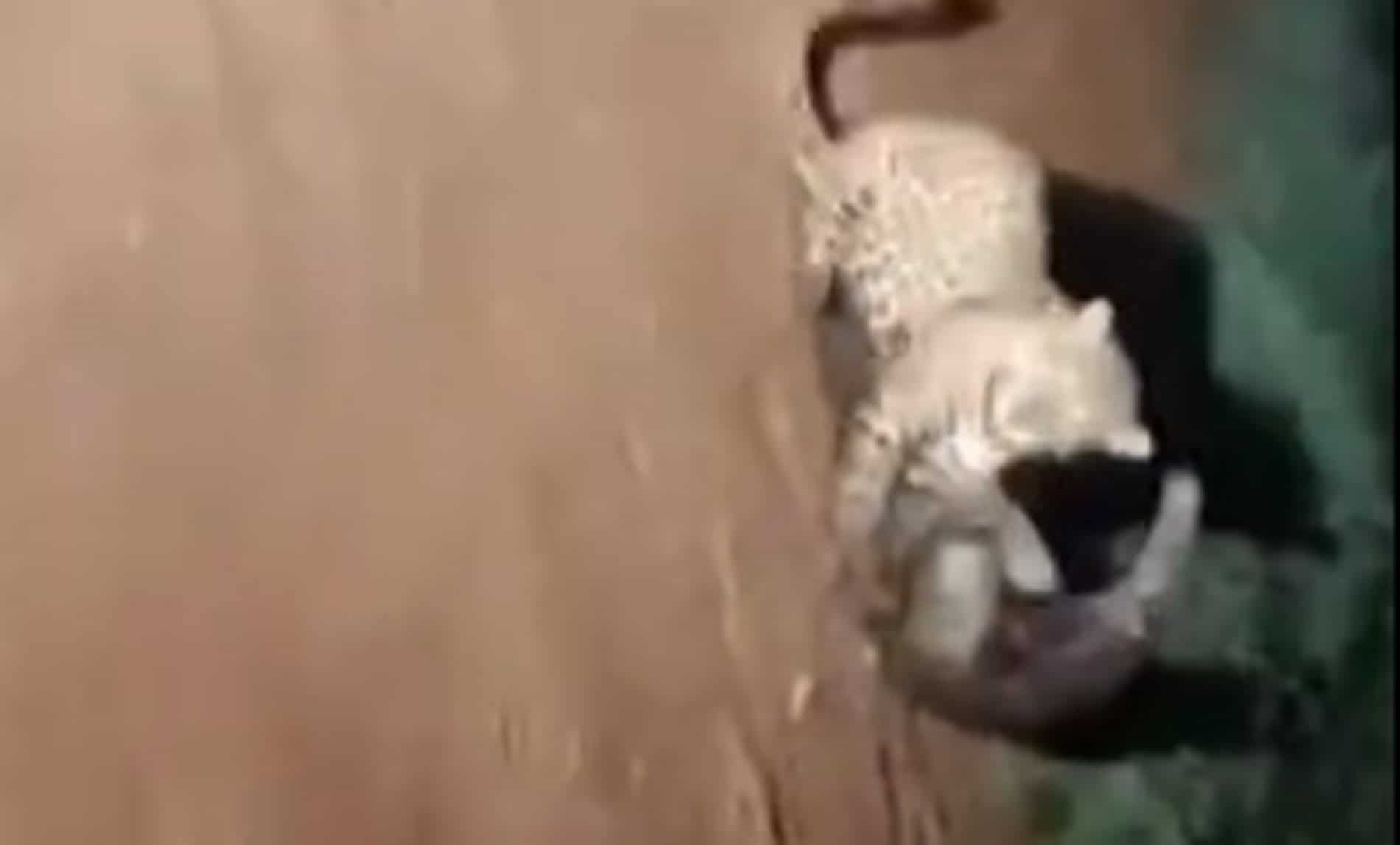 No vídeo, é possível ver o momento em que os animais se encaram e dão início ao embate. O tamanduá surpreende ao conseguir afastar felino, que recua e segue direção à mata.