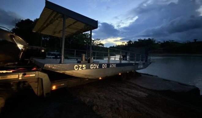 O governo do Estado, por meio do Departamento de Estradas de Rodagem, Infraestrutura Hidroviária e Aeroportuária do Acre (Deracre), lançou na quinta-feira, 9, uma nova balsa no Rio Envira, em Feijó, para efetuar a travessia no Rio Jurupari, na divisa do Acre com o Amazonas.