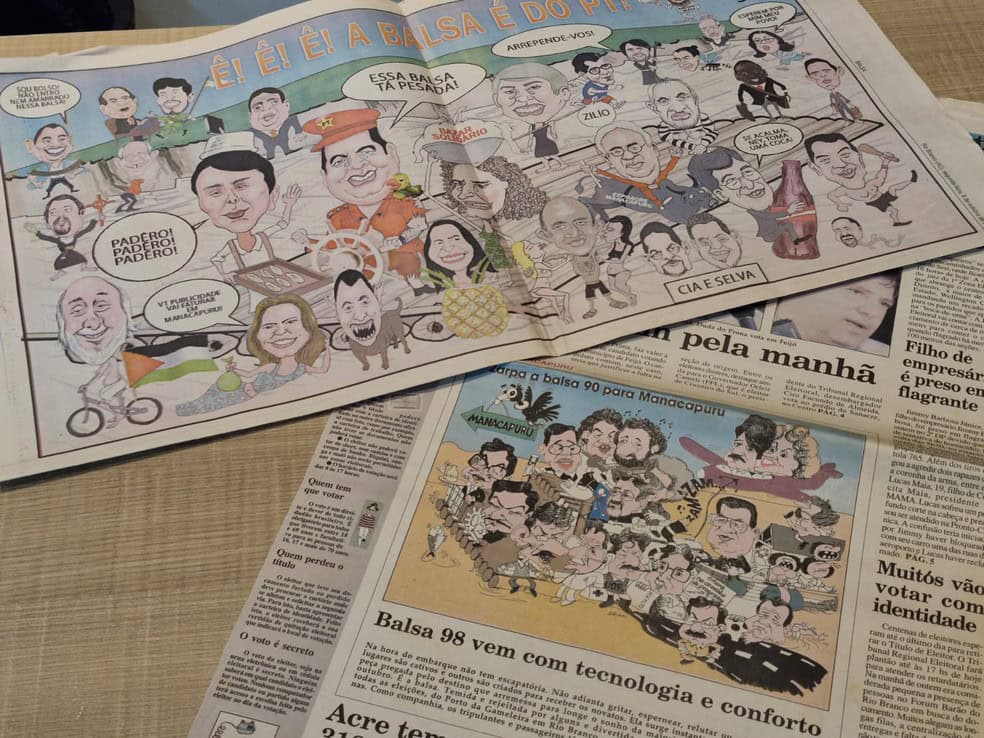Charge de balsa é tradição em jornais impressos do estado; esta retrata as eleições 2024. Foto: Chargista Dim Mendes/A Gazeta do Acre