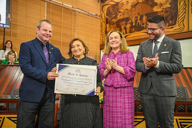 Eva Evangelista, visivelmente emocionada, agradeceu pela homenagem e reforçou seu compromisso com a justiça. “Este reconhecimento é resultado de anos de dedicação, mas também de um trabalho em equipe, onde cada membro do Judiciário desempenha um papel fundamental para que a justiça seja efetiva e imparcial. Estou imensamente feliz e grata com tudo que ouvi neste plenário hoje. Agradeço aos deputados, ao governador do Acre, a todos os magistrados, a todos que me acompanharam nessa caminhada, e sem dúvida, a toda a minha família. Gratidão”, disse.