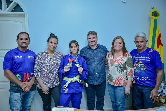 “É com muita alegria que recebo no meu gabinete a nossa aluna atleta de Judô de Epitaciolândia que é destaque nacional. A estudante Melyssa de Souza de 13 anos e sua mãe Maria José.