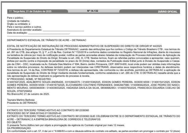 O Departamento Estadual de Trânsito do Acre (Detran-AC) abriu novos processos administrativos para suspensão do direito de dirigir contra motoristas que acumularam infrações ou cometeram faltas graves no trânsito. O órgão publicou nesta terça-feira (21), no Diário Oficial do Estado, a notificação aos condutores que não foram localizados por correspondência.