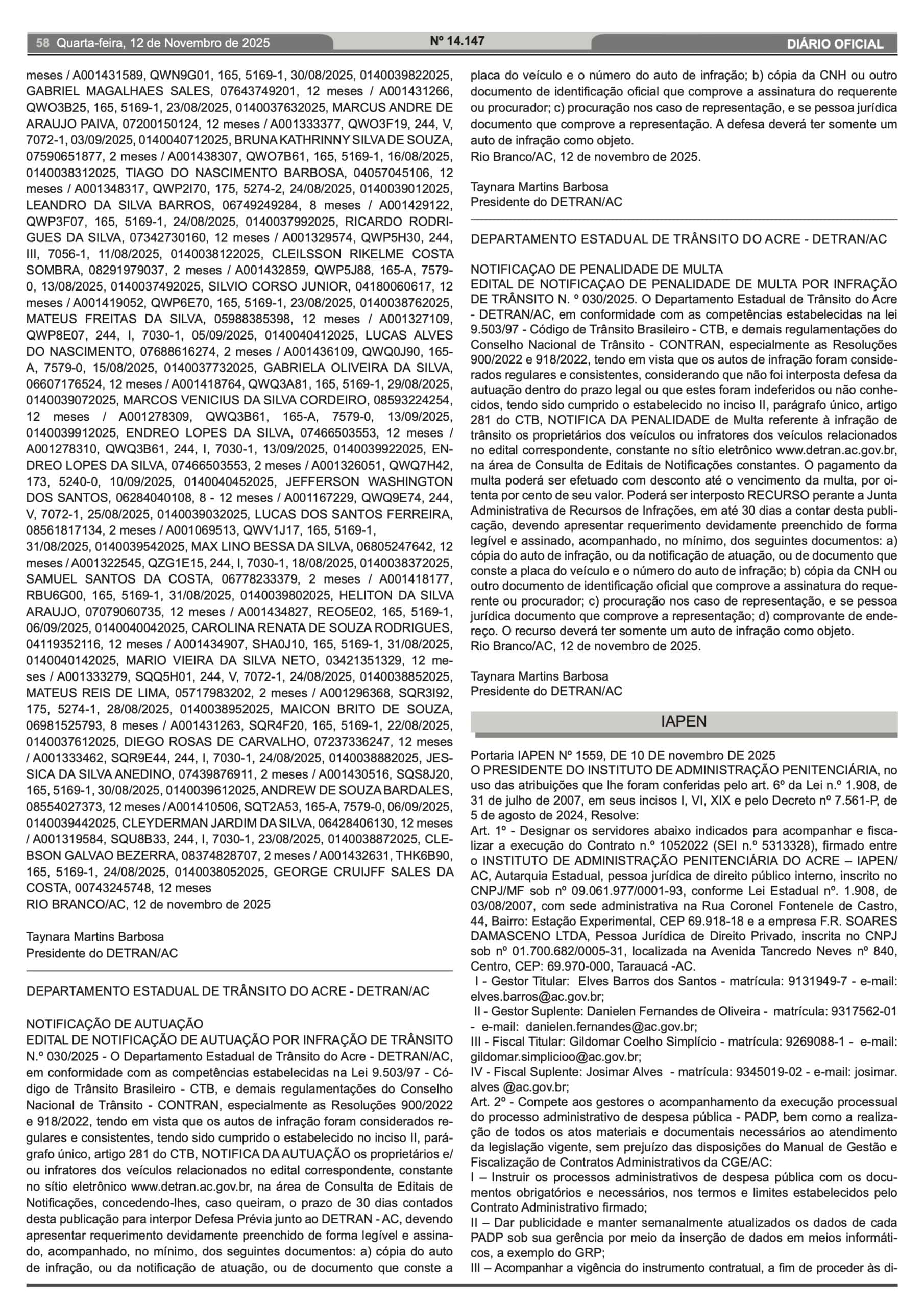 Motoristas acreanos autuados por infrações que podem levar à suspensão da Carteira Nacional de Habilitação (CNH) foram notificados em novo edital publicado nesta quarta-feira, 12, no Diário Oficial do Estado (DOE). O documento, emitido pelo Departamento Estadual de Trânsito do Acre (Detran-AC), reúne os nomes dos condutores envolvidos em processos administrativos de multa e suspensão do direito de dirigir.