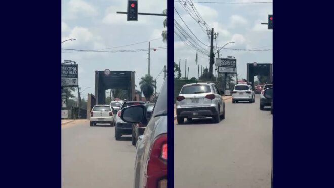 Na ponte metálica que liga os municípios Epitaciolândia e Brasiléia, é comum observar a impaciência de condutores que desrespeitam o tempo dos semáforos, gerando engarrafamentos e riscos de acidentes.