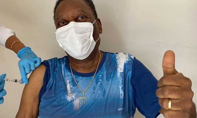 Pelé, que completou 80 anos em outubro, recebeu a vacina por fazer parte do grupo prioritário devido à idade. Ele passa a maior parte do tempo em casa no Guarujá (SP) para se proteger da pandemia.