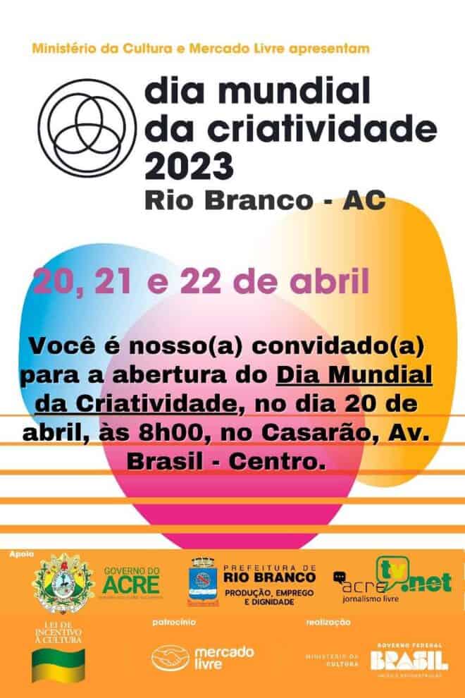 Gastronomia, yoga, artes plásticas, literatura, rap, reciclagem, taekwondo, influência digital. Estes são alguns segmentos que serão apresentados ao público durante a ação Dia Mundial da Criatividade (World Criativity Day), uma iniciativa global que será realizada simultaneamente em 100 cidades do Brasil e outras 30 pelo mundo, de 20 a 22 de abril, por meio de palestras, workshops, oficinas e rodas de conversa presenciais e online. Todas as atividades são gratuitas. A abertura no Acre será no dia 20, às 8 horas, no espaço cultural O Casarão, centro de Rio Branco.
